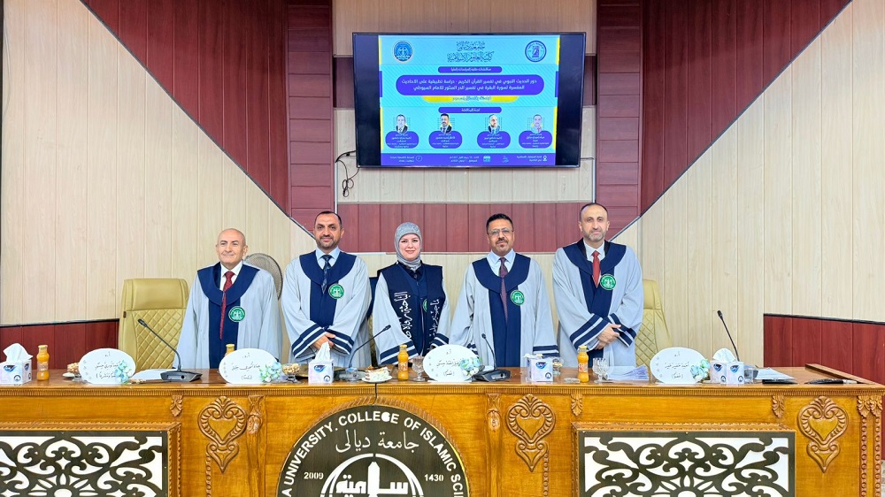 ناقشت كلية العلوم الاسلامية في جامعة ديالى رسالة الماجستير الموسومة بـ (دور الحديث النبوي في تفسير القرآن الكريم – دراسة تطبيقية على الأحاديث المفسرة لآيات سورة البقرة في تفسير الدر المنثور للإمام السيوطي)، للطالبة رفاه طلال احمد .