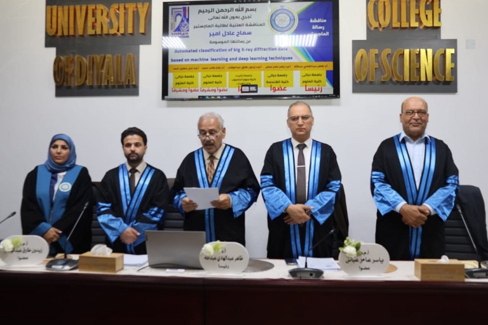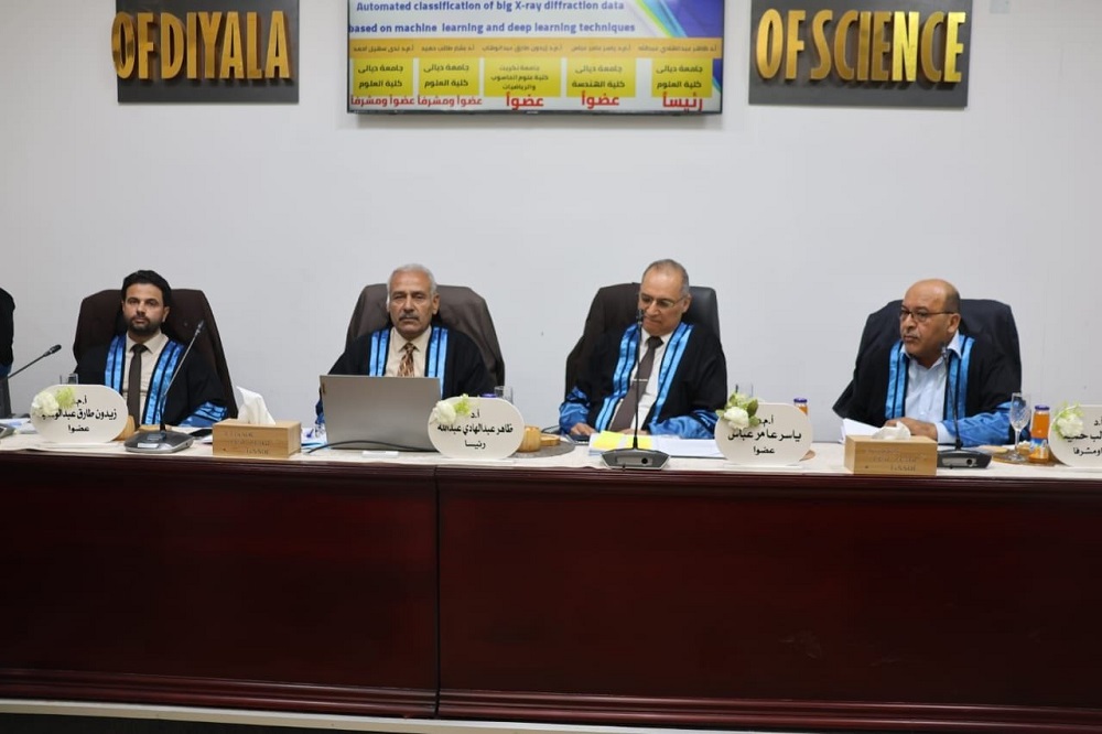 ناقشت كلية العلوم بجامعة ديالى رسالة الماجستير الموسومة بـ (التصنيف التلقائي لبيانات حيود الأشعة السينية الكبيرة استناداً إلى تقنيات التعلم الآلي والتعلم العميق).