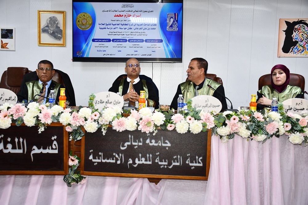 ناقشت كلية التربية للعلوم الإنسانية في جامعة ديالى، رسالة الماجستير في اللغة العربية والموسومة بـ (كتاب المباحث العربية في شرح الكافية الحاجبية للشيخ العلامة محمد بن علي الجرجاني (كان حيا سنة 730هـ) دراسة تحليلية) .