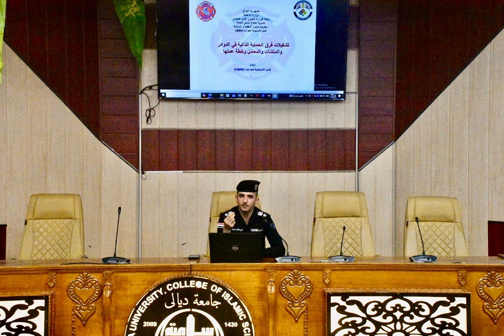 برعاية السيد رئيس جامعة ديالى الأستاذ الدكتور تحسين حسين مبارك وبإشراف السيد مساعد رئيس الجامعة للشؤون العلمية الأستاذ الدكتور عامر محمد ابراهيم نظمت شعبة السلامة والامن الكيمياوي والبايلوجي والاشعاعي بالتعاون مع مركز التعليم المستمر وكلية العلوم الاسلامية ومديرية الدفاع المدني- ديالى ورشة تدريبية بعنوان تشكيلات فرق الحماية الذاتية في الدوائر والمنشآت والمعامل وخطة عملها ، حاضر فيها العقيد علي هاشم محمد مسؤول شعبة الاستجابة للحوادث الكيميائية والبايلوجية والاشعاعية CBRN في مديرية دفاع مدني ديالى .