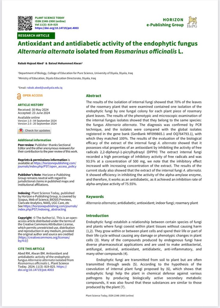في مجلة Plant Science Today الصادرة عن دار النشر HORIZON e-Publishing Group، والمصنفة ضمن مستوعبات سكوبس (Q3).