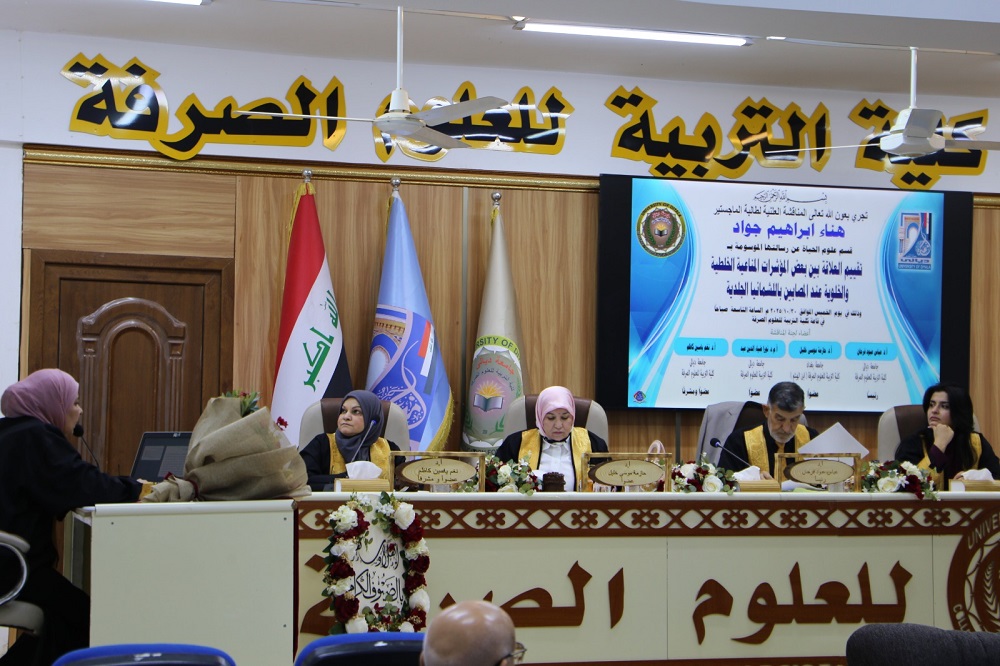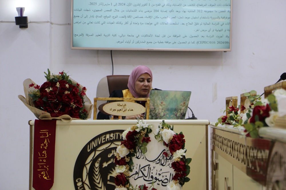 ناقشت كلية التربية للعلوم الصرفة بجامعة ديالى رسالة الماجستير الموسومة بـ (تقييم العلاقة بين بعض المؤشرات المناعية الخلطية والخلوية عند المصابين باللشمانيا الجلدية) ، في قاعة الندوات والمناقشات.