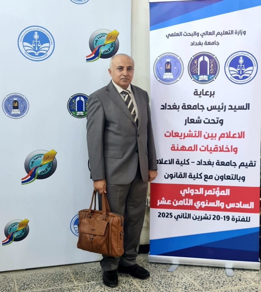 شهدت أعمال المؤتمر الدولي السادس والسنوي الثامن عشر لكلية الإعلام بجامعة بغداد مساهمة علمية وإعلامية متميزة للأستاذ المساعد الدكتور ليث عبد الستار عيادة، مسؤول شعبة الإعلام والاتصال الحكومي في كلية التربية الأساسية بجامعة ديالى بتقديم بحثه العلمي الموسوم: (التشريعات الأخلاقية في الصحافة الإلكترونية العراقية المنظمة لحرية الرأي والتعبير بصحافة الميتافيرس – دراسة استشرافية).