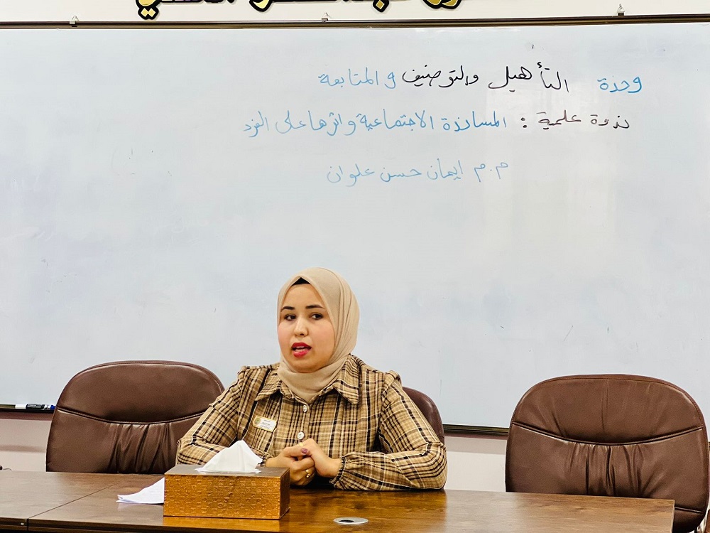 أقامت وحدة التأهيل والتوظيف والمتابعة في كلية التربية المقداد بجامعة ديالى ندوة علمية توعوية بعنوان (المساندة الاجتماعية وأثرها على الفرد)، حاضرت فيها الأستاذ المساعد م.م إيمان حسن علوان.