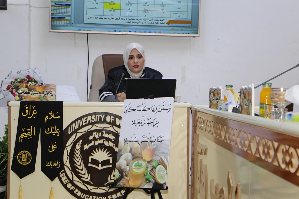 ناقشت أطروحة دكتوراه في كلية التربية للعلوم الصرفة بجامعة ديالى ، دور منظمات النمو النباتية في محتوى الزنجبيل من بعض المركبات الفعالة وأثرها على البكتريا المرضية.