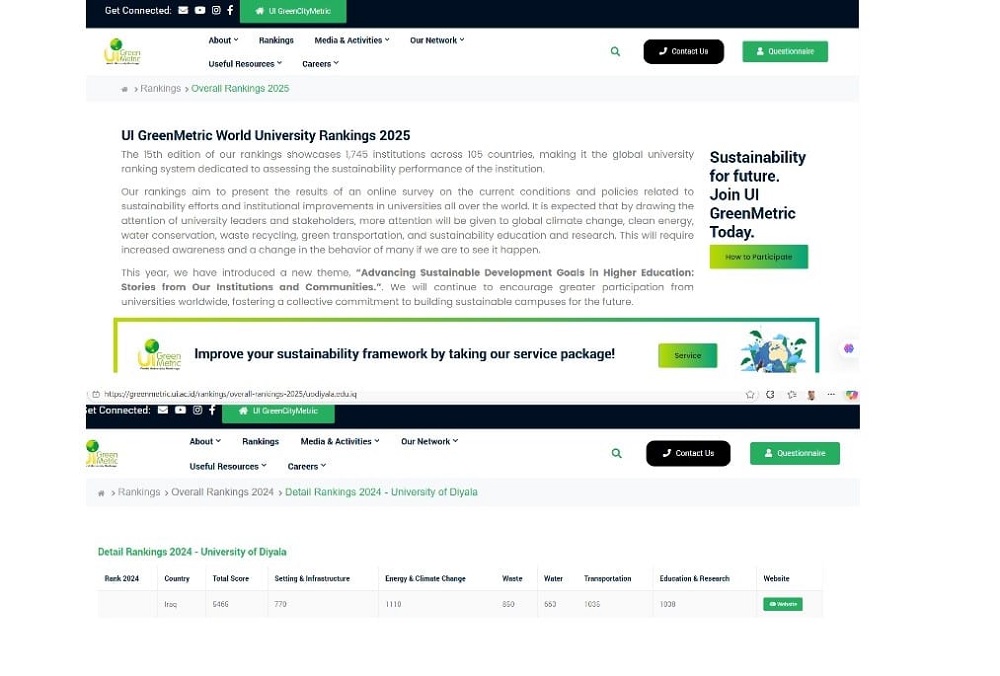 حافظت جامعة ديالى على حضورها الدولي في مجال الاستدامة للسنة السابعة على التوالي بعد دخولها تصنيف UI GreenMetric 2025 الذي يقيس أداء الجامعات في مجالات حماية البيئة والطاقة النظيفة وإدارة الموارد، إذ سجلت الجامعة المرتبة 927 عالمياً من أصل 1547 بنسبة إنجاز بلغت 40% والمرتبة 37 عراقياً من أصل 87 جامعة بنسبة 57.47%، وهو استمرار لمسارها التصاعدي الذي حقق في 2024 المرتبة 735 عالمياً من أصل 1477 بنسبة 50.23% والمرتبة 26 عراقياً من أصل 81 بنسبة 67.9% وفي عام 2023 المرتبة 839 عالمياً من أصل 1183 بنسبة 29.07% والمرتبة 38 عراقياً من أصل 74 بنسبة 48.64%.