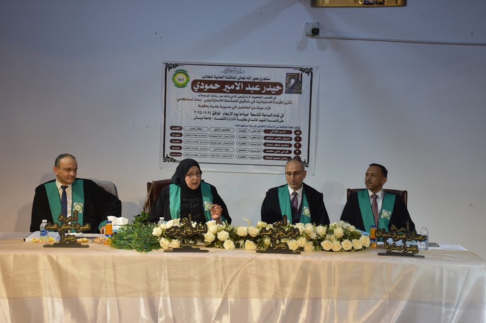 ناقشت كلية الإدارة والاقتصاد في جامعة ديالى رسالة الدبلوم العالي في التخطيط الاستراتيجي الأمني، للطالب حيدر عبد الامير حمودي والموسومة بـ (تأثير القيادة الاحتوائية في تحقيق التماسك الاستراتيجي) بحث استطلاعي لآراء عينة من العاملين في مديرية بلدية بعقوبة، في قاعة الشهيد خالد في رحاب كلية الإدارة والاقتصاد بجامعة ديالى.