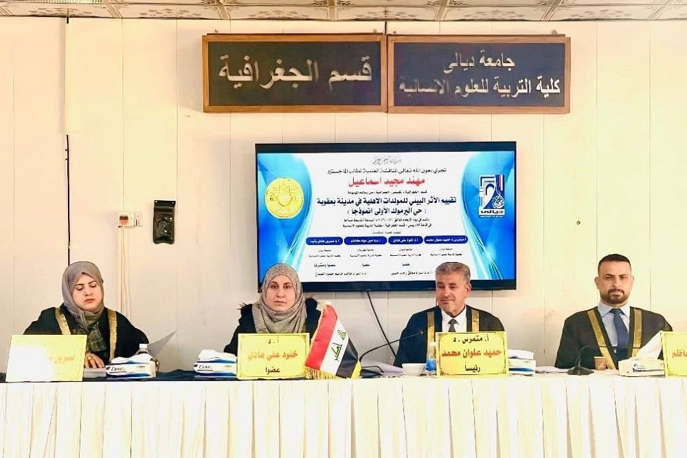 ناقشت كلية التربية للعلوم الانسانية ، بجامعة ديالى رسالة الماجستير في الجغرافية، والموسومة بـ (تقييم الأثر البيئي للمولدات الاهلية في مدينة بعقوبة (حي اليرموك الأولى إنموذجا)) .