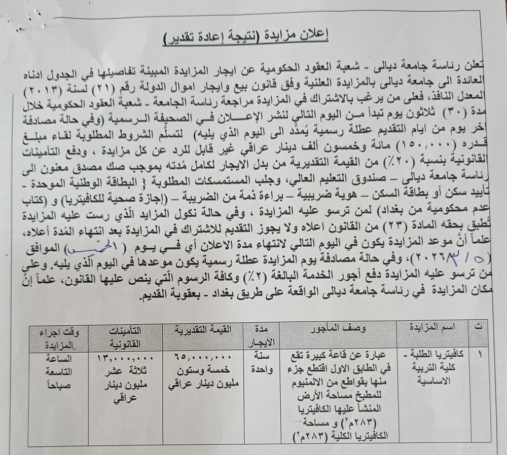 اعلان مزايدة (نتيجة اعادة تقدير) Categories إعلانات, اخبــــار الجامعــــة Date فبراير 9, 2026 اخر تحديث في 09/02/2026 Share: admin_news Previous post تدريسية من كلية التربية للعلوم الإنسانية تصدر كتابًا علميًا جديدًا عن تعليم اللغة الإنكليزية في العصر الرقمي فبراير 9, 2026 Next post كلية القانون والعلوم السياسية تقيم ورشة حول أثر العدالة وحقوق الإنسان على المرأة فبراير 9, 2026 You may also like إصدار علمي جديد من جامعة ديالى يؤسس لمرحلة تشريعية رقمية متقدمة في العراق 16 أبريل, 2026 ضمن توجهات رئاسة جامعة ديالى لتطوير الإعلام المؤسسي.. اختتام دورة تخصصية لتعزيز كفاءة الكوادر الإعلامية ومواكبة التحول الرقمي 15 أبريل, 2026 رئيس جامعة ديالى يشارك في مؤتمر وطني لتعزيز اقتصاد المعرفة وبناء الجامعات الريادية 14 أبريل, 2026