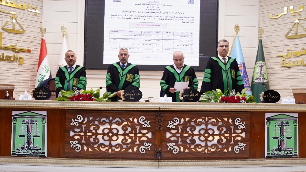 ناقشت كلية القانون والعلوم السياسية بجامعة ديالى، رسالة الماجستير الموسومة بـ (حرية تغير المعتقد والدين واثره في حقوق الاسرة في ضوء المواثيق الدولية ) ، للطالبة مروى علاء حسين .