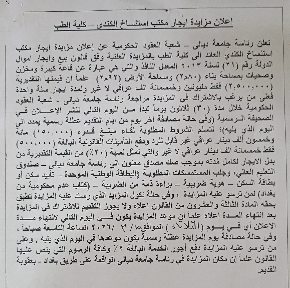 اعلان Categories إعلانات, اخبــــار الجامعــــة Date فبراير 24, 2026 اخر تحديث في 24/02/2026 Share: admin_news Previous post كلية التربية المقداد تُقيم دورة عن استخدام الذكاء الاصطناعي لكشف احتيال بطاقات الدفع وتعزيز الأمن المالي فبراير 24, 2026 Next post ندوة علمية في أساسية ديالى عن المصطلح النحوي من الأصل إلى الوضع فبراير 24, 2026 You may also like جامعة ديالى تشارك في الحفل التأبيني لاستشهاد السيد محمد محمد صادق الصدر وتؤكد ترسيخ القيم الوطنية والإنسانية 24 أبريل, 2026 رئيس جامعة ديالى يقود الفريق الوطني لاعتماد برامج كليات العلوم في تكريت…تقييم ميداني شامل لبرنامج الرياضيات ضمن مسار الارتقاء بجودة التعليم العالي 24 أبريل, 2026 جامعة ديالى تواصل تألقها الدولي وتحقق مرتبة متقدمة في تصنيف التايمز الآسيوي 2026 23 أبريل, 2026