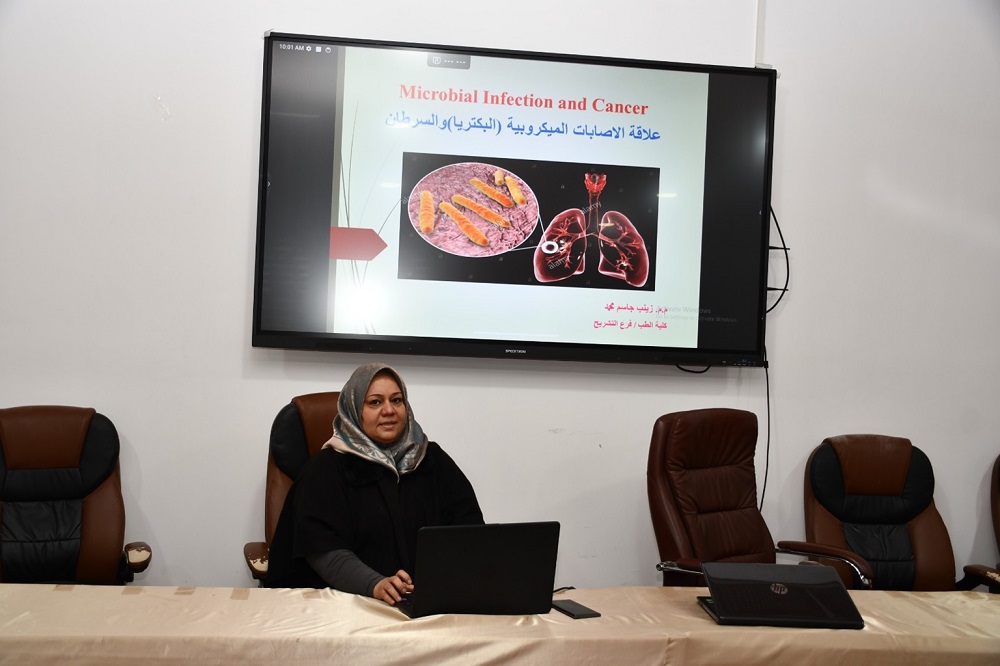 بإشراف عميد كلية الطب الأستاذ الدكتور إسماعيل إبراهيم لطيف، أقامت شعبة التعليم المستمر ندوة علمية بعنوان (علاقة الإصابات الميكروبية بالسرطان) حاضرت فيها المدرس الدكتورة زينب جاسم محمد.