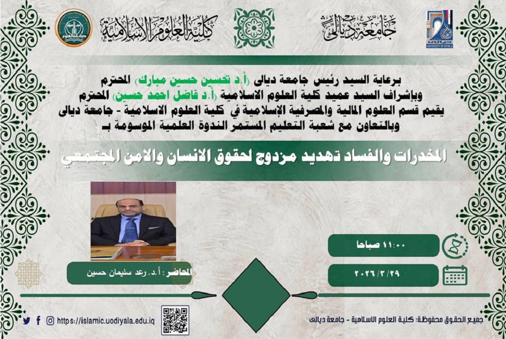 اقام قسم العلوم المالية والمصرفية الاسلامية في كلية العلوم الإسلامية بجامعة ديالى ندوة علمية بعنوان (المخدرات والفساد – تهديد مزدوج لحقوق الإنسان والأمن المجتمعي ) بمشاركة نخبة من التدريسيين والطلبة ، حاضر فيها الاستاذ الدكتور رعد سليمان حسين .