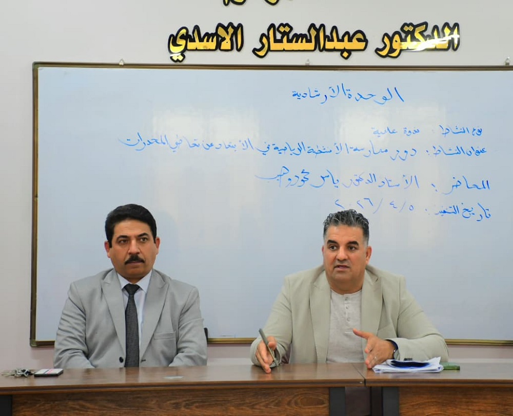 أقامت وحدة التأهيل والتوظيف والمتابعة في كلية التربية المقداد بجامعة ديالى، ندوة بعنوان ( دور ممارسة الانشطة الرياضية في الابتعاد عن تعاطي المخدرات ) ، حاضر فيها الاستاذ الدكتور ياسر محمود وهيب ، في قاعة المرحوم الدكتور عبد الستار الأسدي .