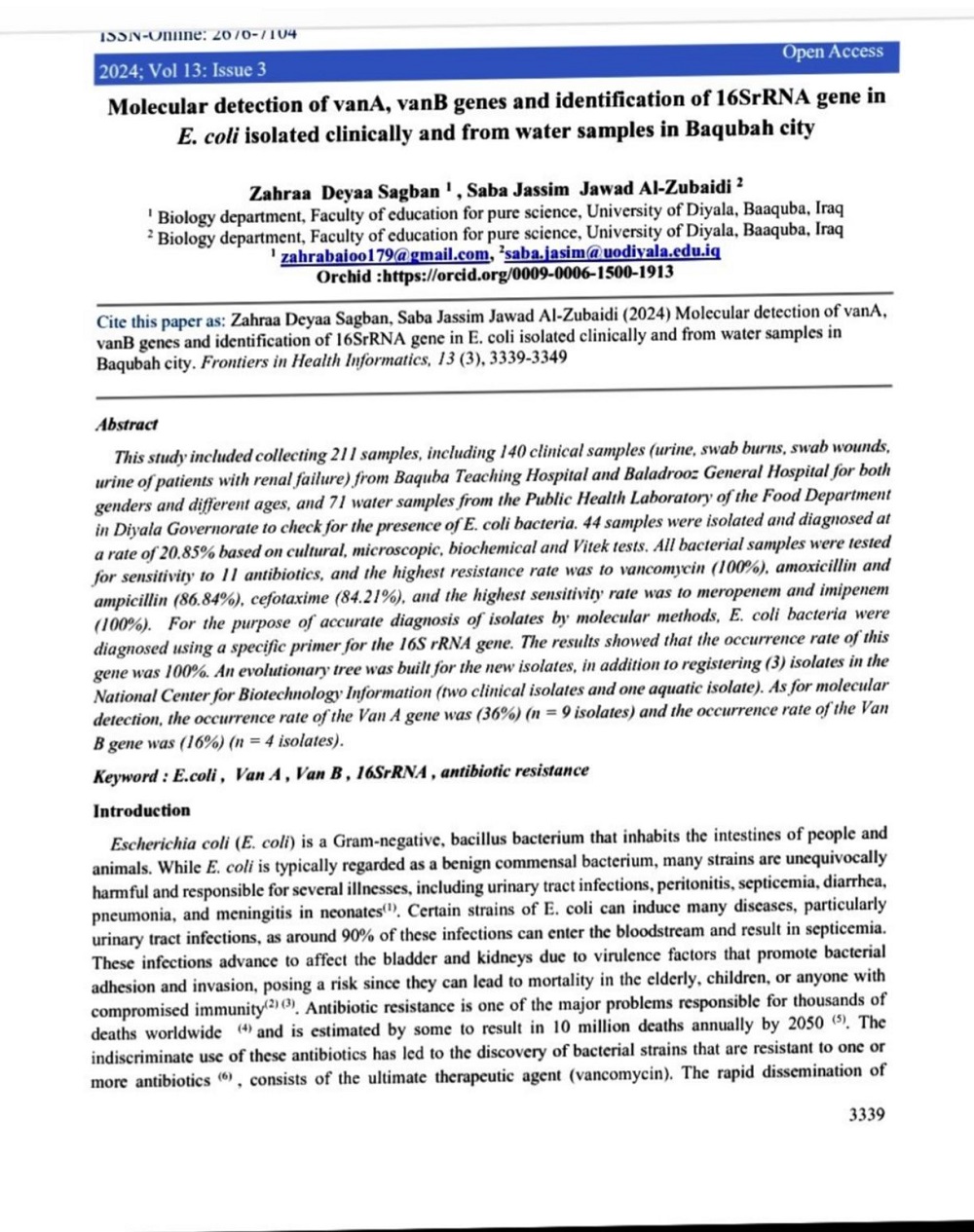 نشرت التدريسية من قسم علوم الحياة في كلية التربية للعلوم الصرفة بجامعة ديالى الأستاذ الدكتورة صبا جاسم جواد بحثاً علمياً بعنوان (Molecular detection of VanA , VanB genes and identification of 16SrRNA gene in E.coli isolated clinically and from water …
