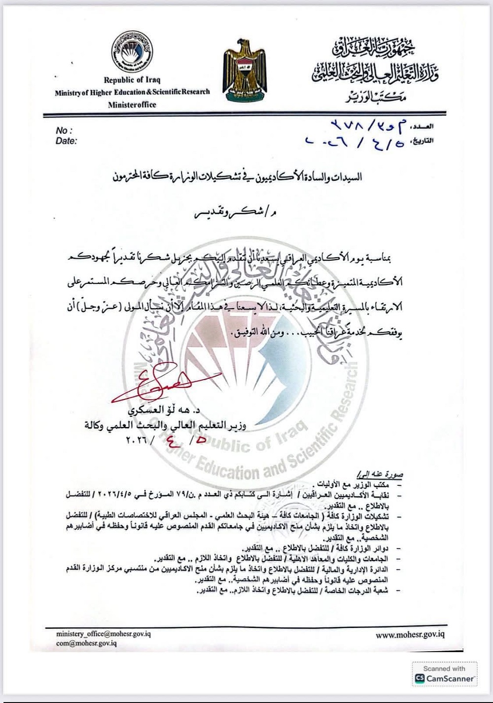 أعلنت وزارة التعليم العالي والبحث العلمي عن منح كتاب شكر وتقدير إلى جميع الكوادر التدريسية في الجامعات والمؤسسات الأكاديمية، وذلك بمناسبة يوم الأكاديمي العراقي، تثميناً لجهودهم العلمية والتربوية المتميزة. وأكد معالي وزير التعليم العالي والبحث العلمي الأستاذ الدكتور هە ڵۆ …